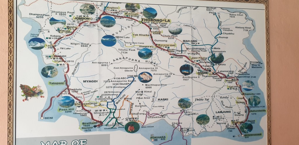 Had a quick lunch in a little restaurant. There’s a few other trekkers around, though they all seem to be in groups with porters rather than solo with a guide as I am. Studied the map of the route up on the wall, and realised I have no idea of how badly the altitude is going to affect me, especially later on. In a minute, we’re heading to grab a shared jeep with some strangers up to Chame (2670m), which should take about 4 hours. Am hoping the jeep has more legroom than the bus, otherwise my spine might genuinely never recover.