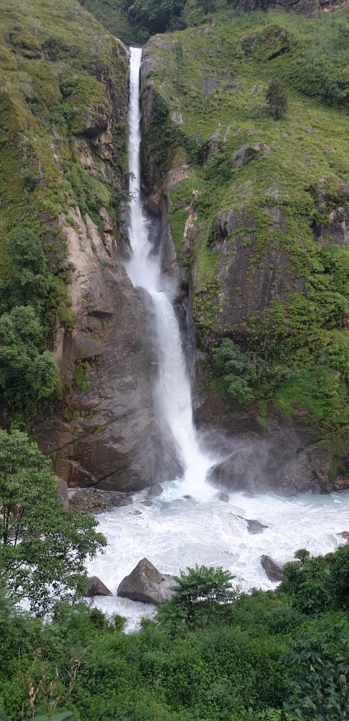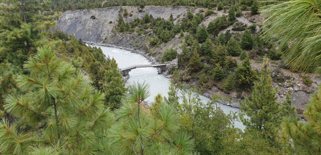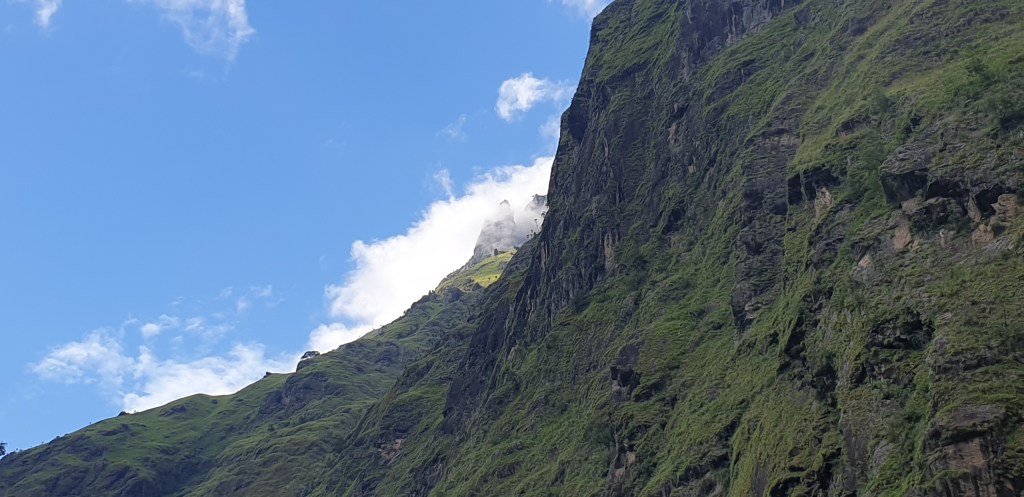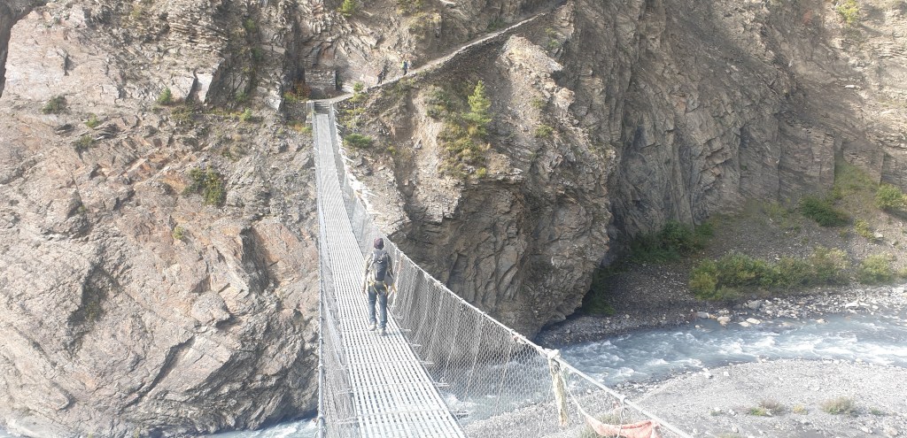 These landscapes are a dream come true. Periodically I get bursts of joy at the view and feel incredibly glad to have come. Like in Mussoorie [a hill station I visited in India] vertiginous, sheer drops threaten a clumsy traveller at the edge of the trail, while soaring cliff faces rise on the other side. We passed through a sort of open cave, where the mountain had been blasted away to make the road. Between that and a narrow cable bridge that hung over white water below, this feels like the trip is all worth it already.