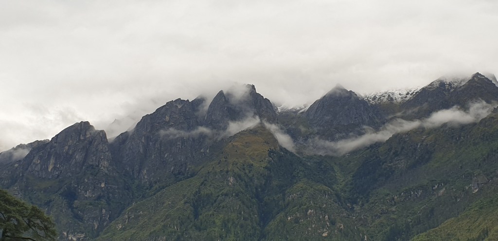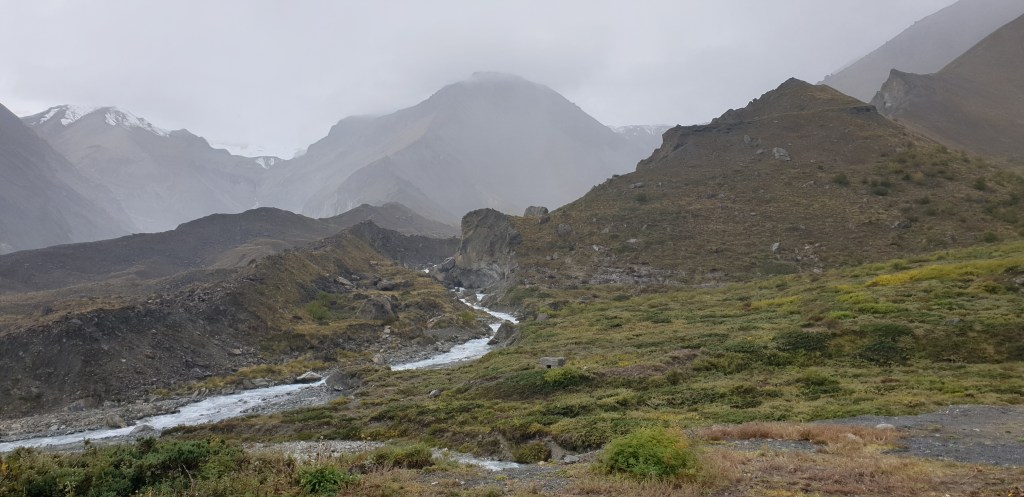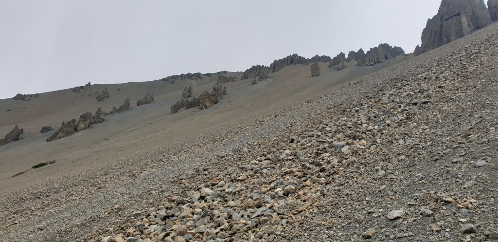 There’s something of Scotland in the muted purple and brown flora and dark rocks, and yet the topography is completely alien. Boulders like blades stick from the scars left by landslides. Only 5 minutes ago we were staring back down the valley we’ve spent 2 days traversing, now we’re in another country.