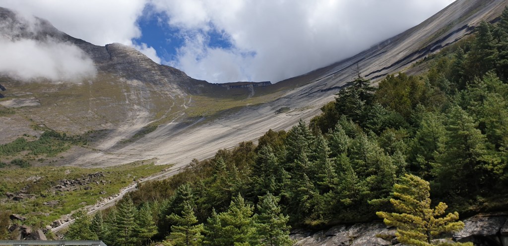 At about the halfway point of the journey in terms of time, a recent landslide had buried the path in scree. We began to descend sharply, though my enthusiasm for this downhill section was tempered by the knowledge we have to return this way tomorrow. As we scrambled down the slope, we’re hit by a fierce but brief downpour, the drops of which hurt not because of their velocity but because they’re freezing. Slipping down the loose rocks in the hail reminds me that sometimes the best part of a journey like this is in the recounting, not the experiencing.