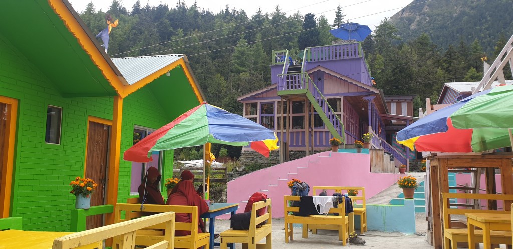 Chame is arranged along the trail, with colourful teahouses lining the path. Some had their bricks painted in a chessboard fashion of alterating hues, and the effect is striking and welcoming. Sujan mentioned this was the last place we can really trust the meat to be fresh, and it has the air of a final comfort stop, with shops selling climbing equipment next to shelves of Gorkha beer (which is thick and a little sickly).