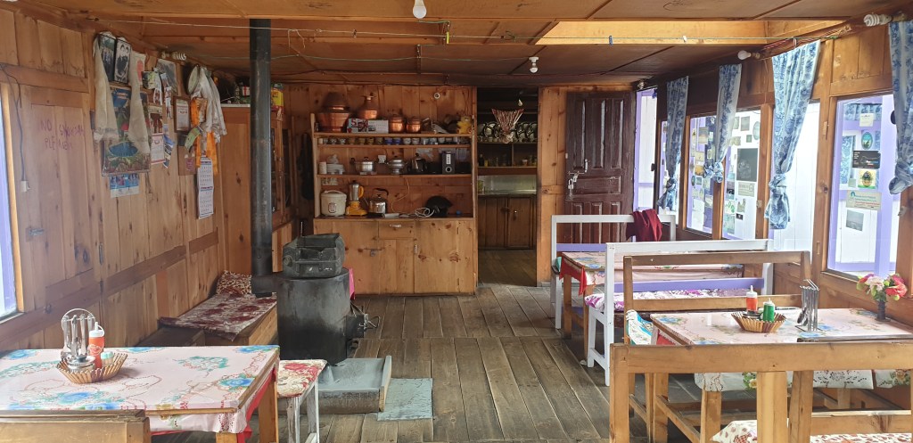 Over supper in the teahouse common room, heated by a welcome open fire, finished my BRAT diet for the day with a filling if flavourless veg curry and a mountain of rice. Will still take one of the Nepalese Immodium equivalents I picked up in Kathmandu before we set off tomorrow. At least I hope it’s Immodium, and that the pharmacist didn’t misunderstand my gestures and sell me a laxative.