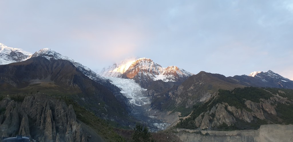 Nearly managed a full 6 hours sleep, before my bowels took it upon themselves to act as a drill sergeant and had me outside my room before 6. Glad they did. The dawn light glinted off Gangapurna, golden in hue and incredible against the blue of the sky. It was a truly unforgettable view and an experience I’ll always remember. Unfortunately the same’s true of my subsequent visit to the squatter toilet.