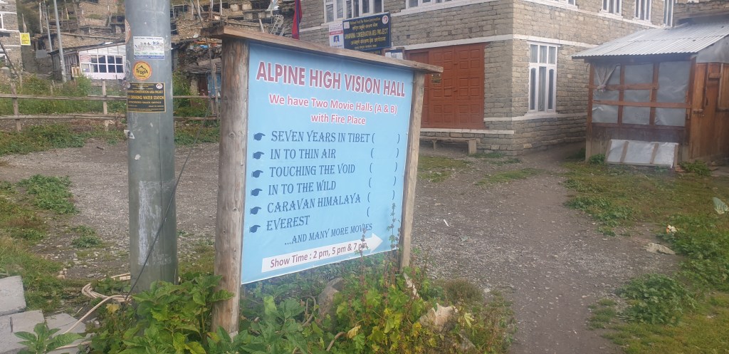 Manang is probably the last ‘luxury’ stop of the trek this side of Thorong-La Pass. It has pizza and pasta on the menus, rooftop bars, and a few of the hotels have their own miniature cinemas. Disconcertingly, they all seem to mostly be showing films about the ‘96 Everest disaster.