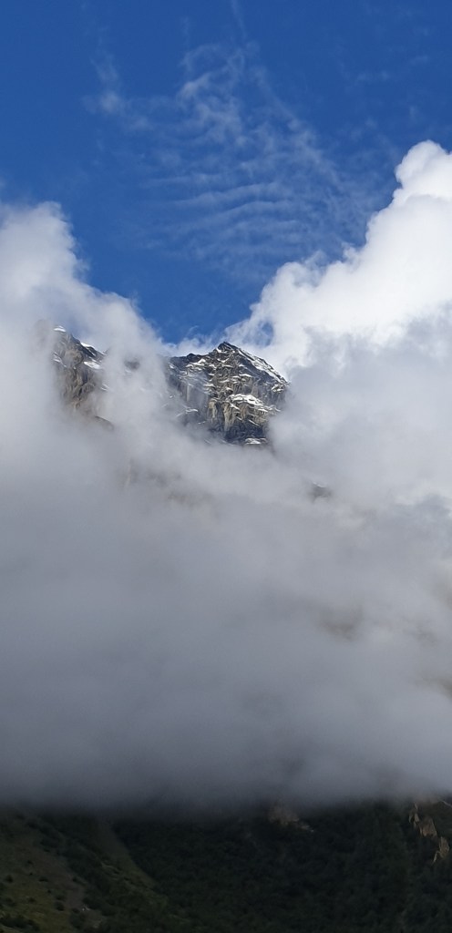 I’ve written (inadequately) about the look of the landscapes we’ve walked through, but the Himalaya appeal to the other senses too. There’s a sweet smell of mint and wet grass in the air, which can transition without warning into the stink of wet yak droppings. The sun’s heat is sharp and powerful, verging on painful at times, though standing still for any period of time makes you aware of the chill of the altitude too. The quiet is occasionally subsumed by wind through the valleys, though each day has had different accompaniment. On day 1, waterfalls roared away to either side, while today birdsong disrupts the silence. The rare jeep or tractor announces itself with music and horns, while locals hocking up spit round the bend ahead is often the first sign they’re there.