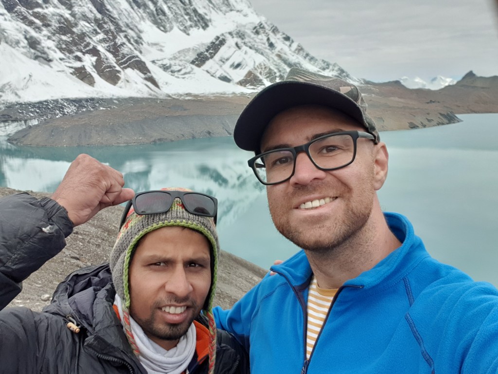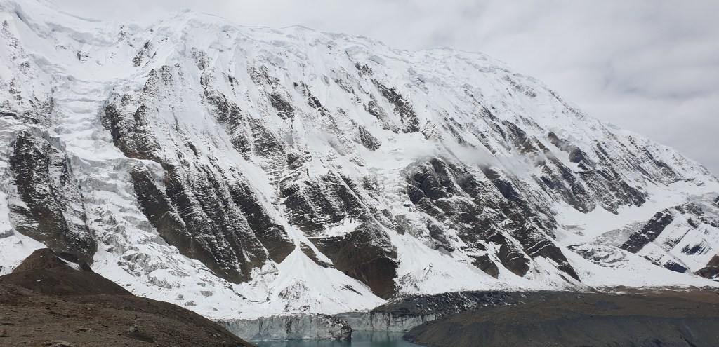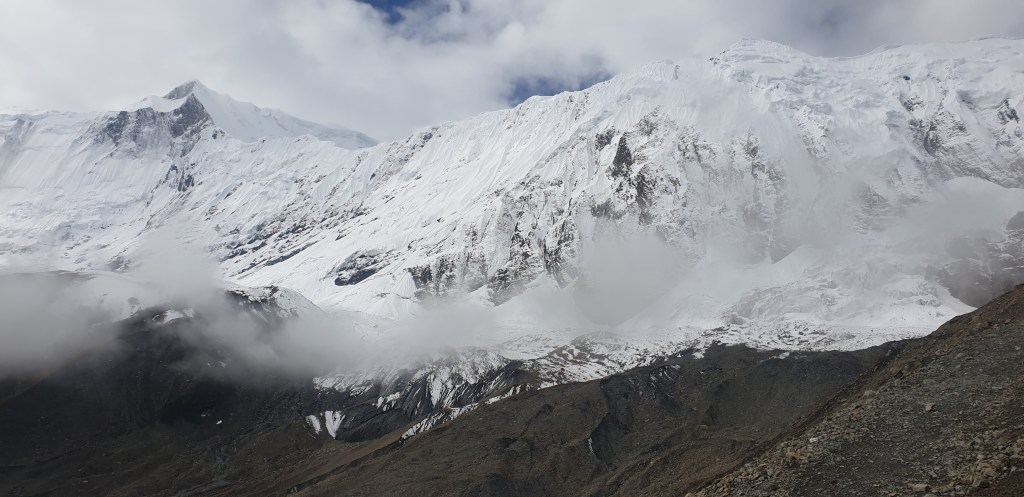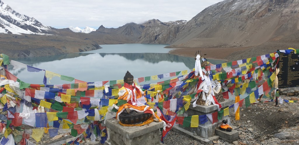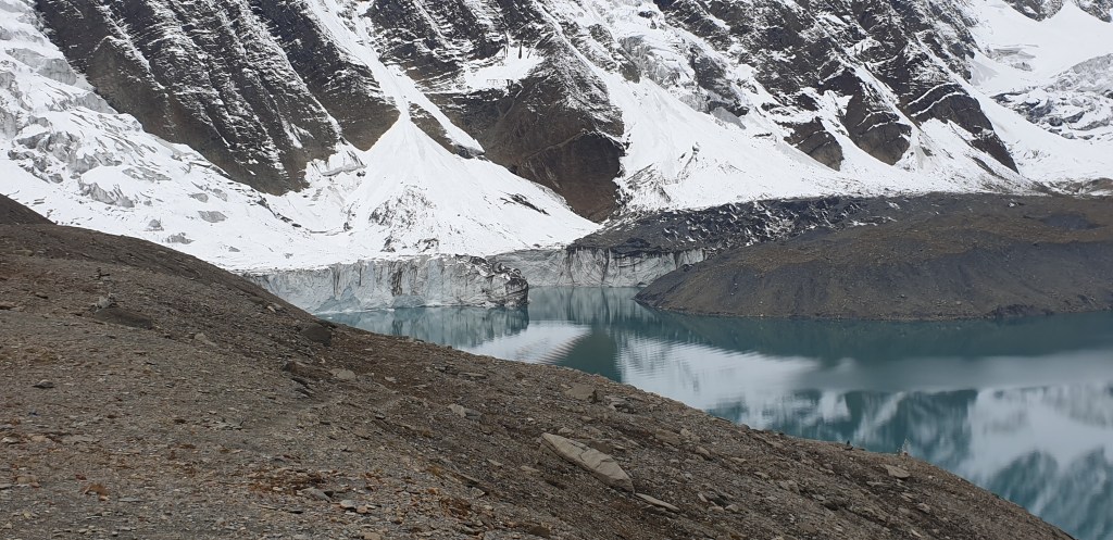 Eventually, with a brief fanfare of gusts of winds and streams of prayer flags, Tilicho Lake (5000m) spread out in front of us. It immediately felt worth it. It’s 4km long and 85m deep, containing 155 million litres of fresh water. It almost glows, even under the overcast sky, a blue-green that’s almost turquoise. The shore slopes gently down to its edge, save for on one side where ice cliffs plunge into the water. It’s beautiful and wild and, as my first glacial lake, doesn’t disappoint. The little café on the bluff above the lake doesn’t disappoint either, with hot chocolate and – thankfully – bottles of water that I chug until I feel sick.