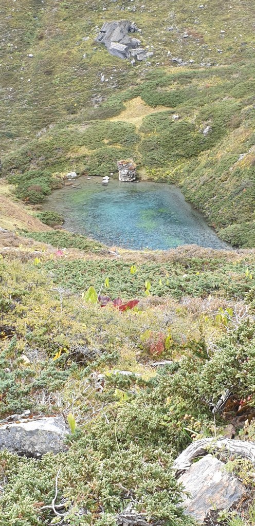 The first hour is much the same as yesterday, though periodically the clouds peel back to reveal a mountain range. I’m unused to landscapes of this scale and it messes with my sense of distance. Ridges that seem just round the corner take hours to approach, while colourful flecks in the distance behind us turn out to be groups we only passed 15 minutes ago.