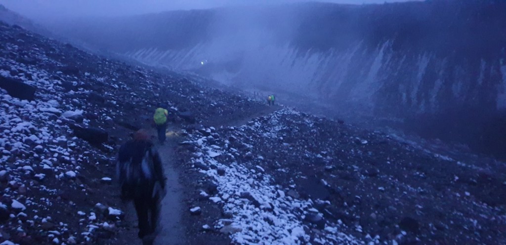 That was severely shaken as we passed 5,100m, with about an hour still to go before we reached the highest point. A combination of – I think – my lack of acclimatisation time, the cough, and general lack of fitness meant that I was suddenly struggling to breathe. No matter how much I gasped I couldn’t fill my lungs to the extent I needed to keep moving; I could only breathe normally when I stood still. I vividly remember being bent double on the wider, white, open slopes, panicking that I couldn’t get enough air. I managed to calm down, but the worry never really left, and I struggled to carry on for more than a few steps at a time.