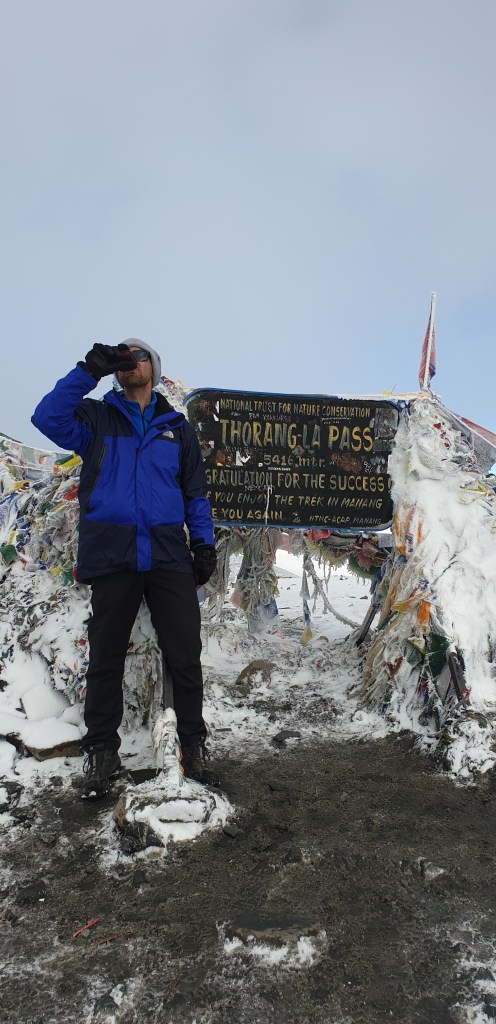 Gradually the climb began to taper off, and before I could even really register it I was among a crowd hovering around the marker that proclaimed we’d reached the head of the Pass, at just over 5,400m above sea level (lower than Kilimanjaro). Sipped some whisky that I’d been saving for this moment, took some photos, and failed to feel much more than abject, pathetic relief.