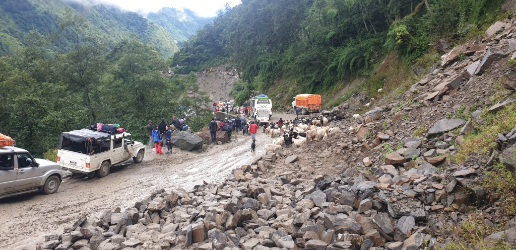 Eventually the coach halted, in the middle of a long tail of vehicles delayed by another landslide. I thought this might be a neat way to bookend the trek, but as close to four hours slowly ticked by my annoyance turned to anger. Herds of goats streamed past, and while I sat on a rock outside reading I watched their herders beat them viciously to keep them on track. Wished I could do the same to the bus – at least the goats were moving. They evidently weren’t fainting goats, either, given the noise from all the horns.