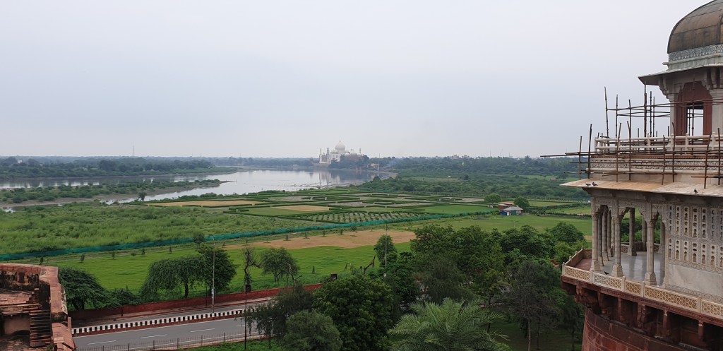 There’s an insane amount of history packed between its walls, though, from the original marble mosques to the drab concrete viewing platform, from which you can see the Taj Mahal in the distance, resting on a bend in the river.