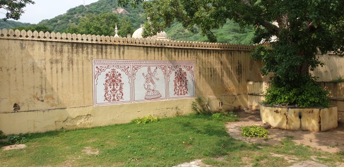 First stop on the tour was the City Palace, the centre of Jaipur and still the residence of the royal family. A series of nice and airy courtyards, with small residences and buildings – again with utter symmetry – converted into museums. The paintings and illustrations section had some amazing centuries-old maps of other buildings in Rajasthan, used in Jaipur’s planning stages. It also had a floor-to-ceiling painting of Rajasthan’s local deity, which it turned out pulled double duty as a portable shrine when a permanent one wasn’t available.